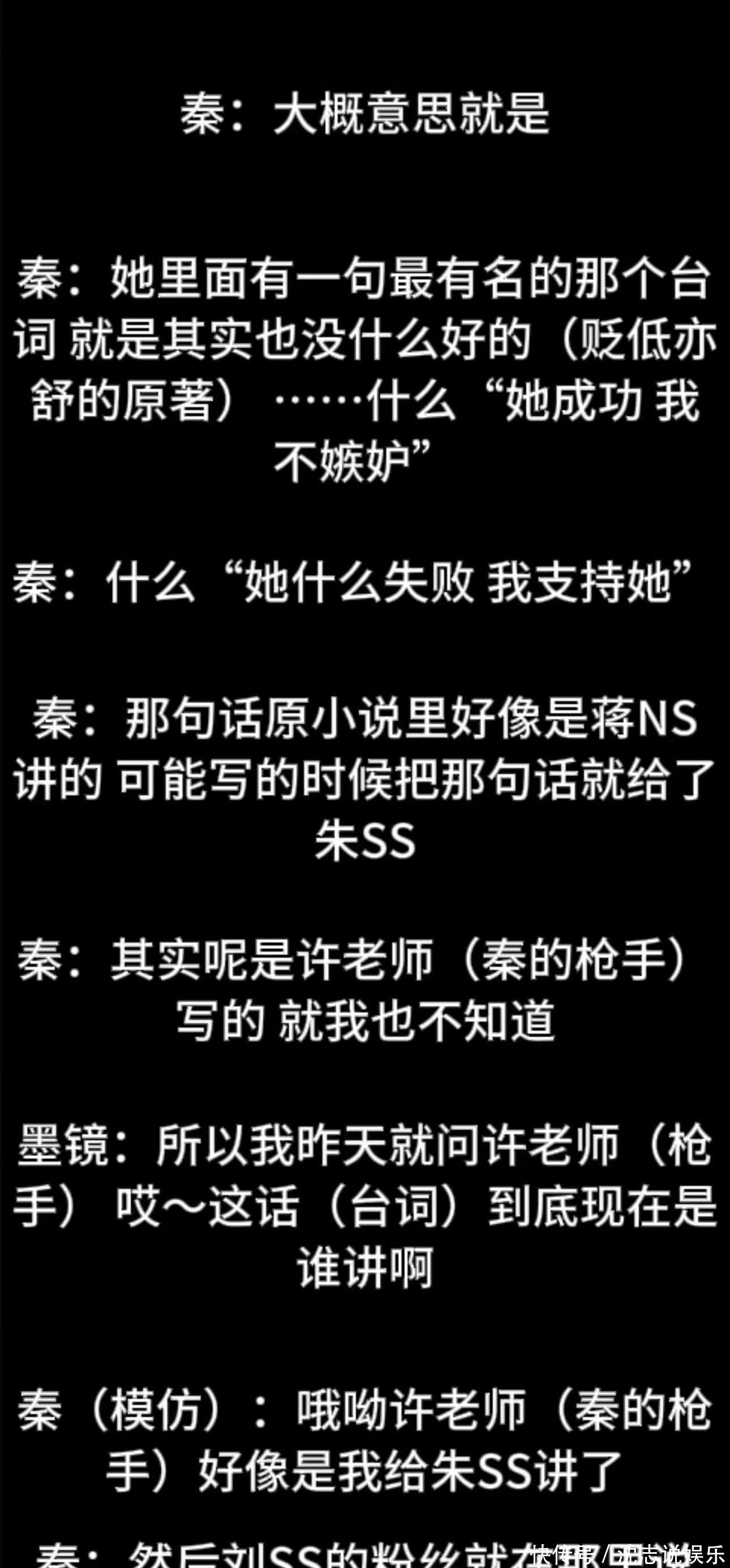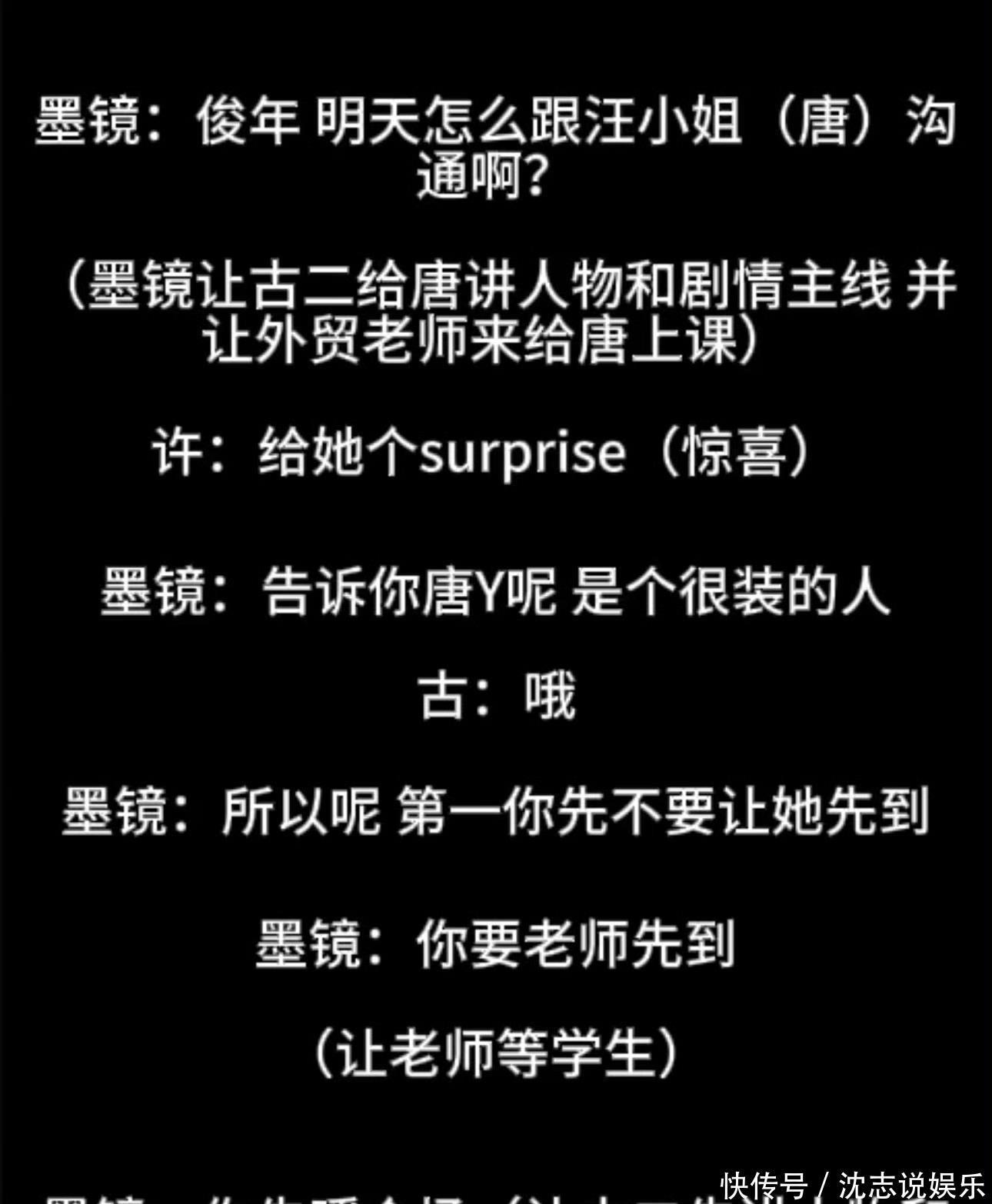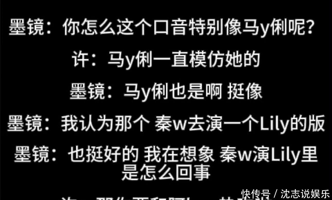 吐槽唐嫣:“是个很装的人。”(说让外贸老师来给唐嫣上课的时候一定不要让她先到,要让老师先到)许姓工作人员说马伊琍模仿秦雯说话,王家卫还说让秦雯去演个Lily版。